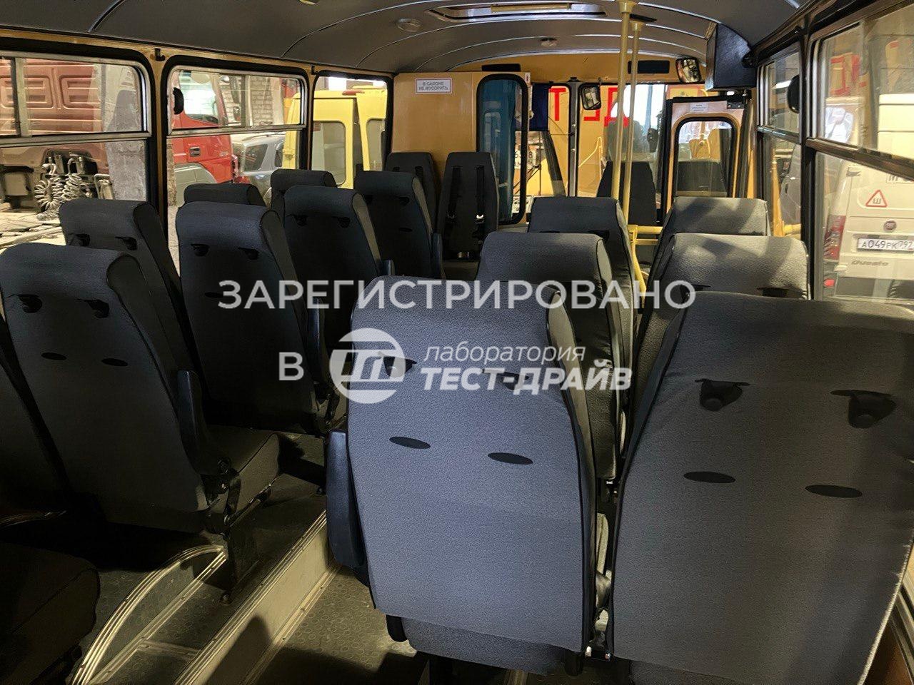 Доработки проведены для перевода автобуса из категории транспортного средства для перевозки детей в стандартный пассажирский автобус с установленными ремнями безопасности для всех пассажиров.